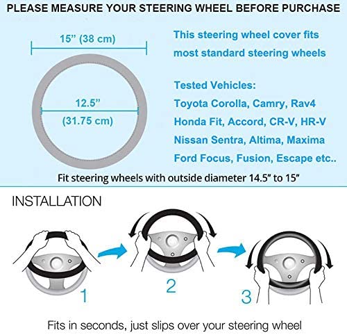 [Universal Steering Wheel Cover]: Fits most middle-size steering wheels with outside diameter 14 1/2 inch to 15 inch(37cm to 38cm) including trucks, jeeps, sedans, vans, SUV, MPV