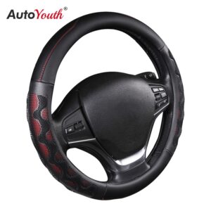 AUTOYOUTH Fashion PU Leather Steering Wheel Cover Fits 38cm/15 inch Diameter Hot Sale Red Wavy Bold Line Splice X-stitch Pattern